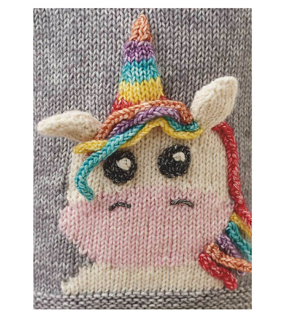 This little unicorn sweater is full of lovely contrasts. The main pieces are mostly worked in stocking stitch, and are trimmed with neat garter stitch edging at the hem, neckline and cuffs. The bright colours of the rainbow stripes are beautifully contrasted with the background grey and really standout as a result. Then there is the gorgeous unicorn poking his head up above the hem - he’s a delight and kids will adore him.