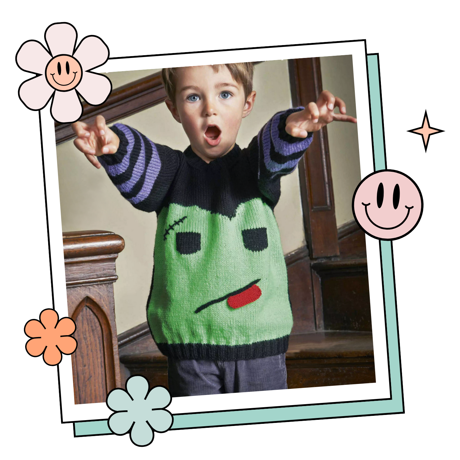 Monster Mash Sweater, Kids Frankenstein Halloween Jumper Knitting Pattern