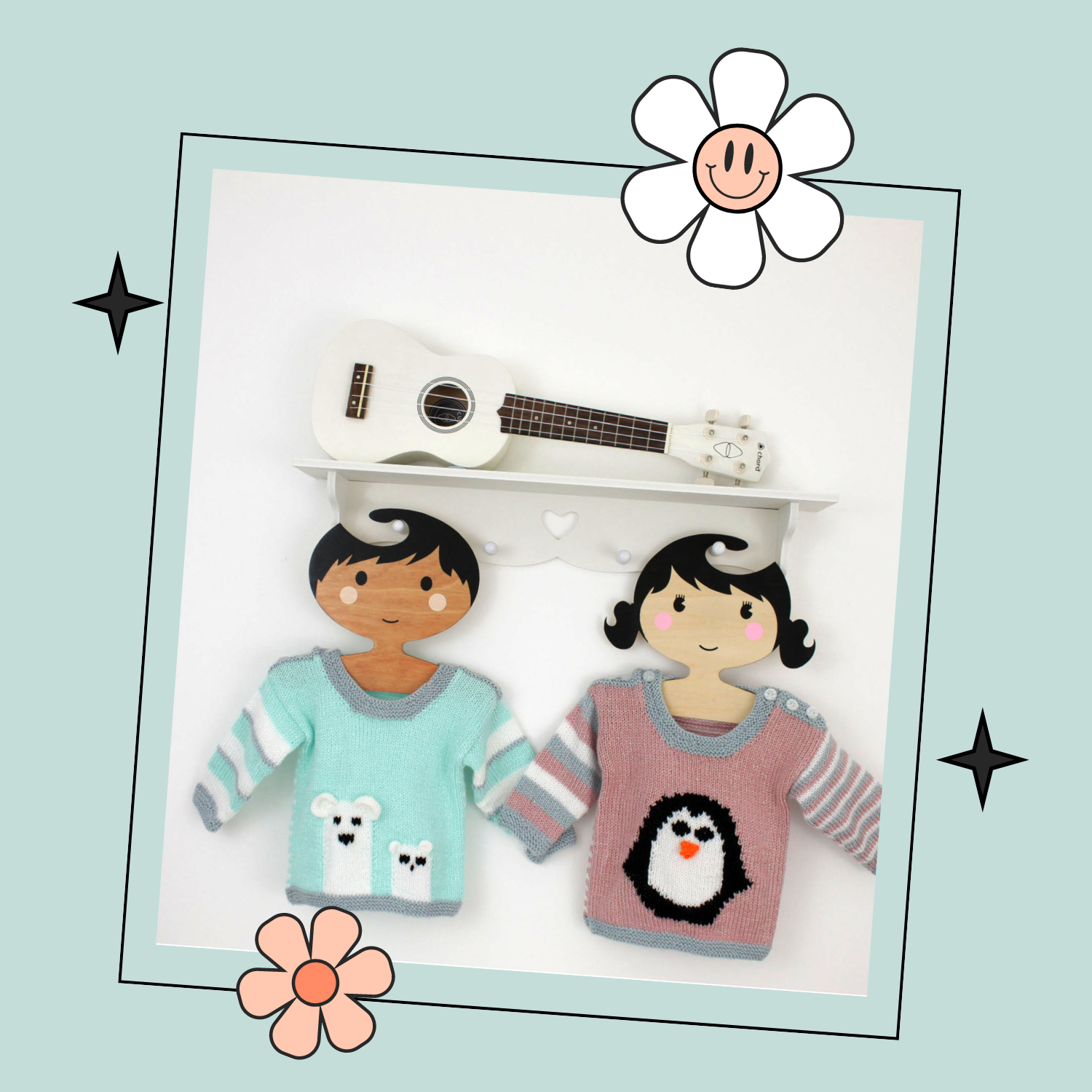 The Penguin and Polar Bears are worked in intarsia with small duplicate stitch details to keep it simple with only a few colours. Applique pieces add depth and character for the Bear and Ears.