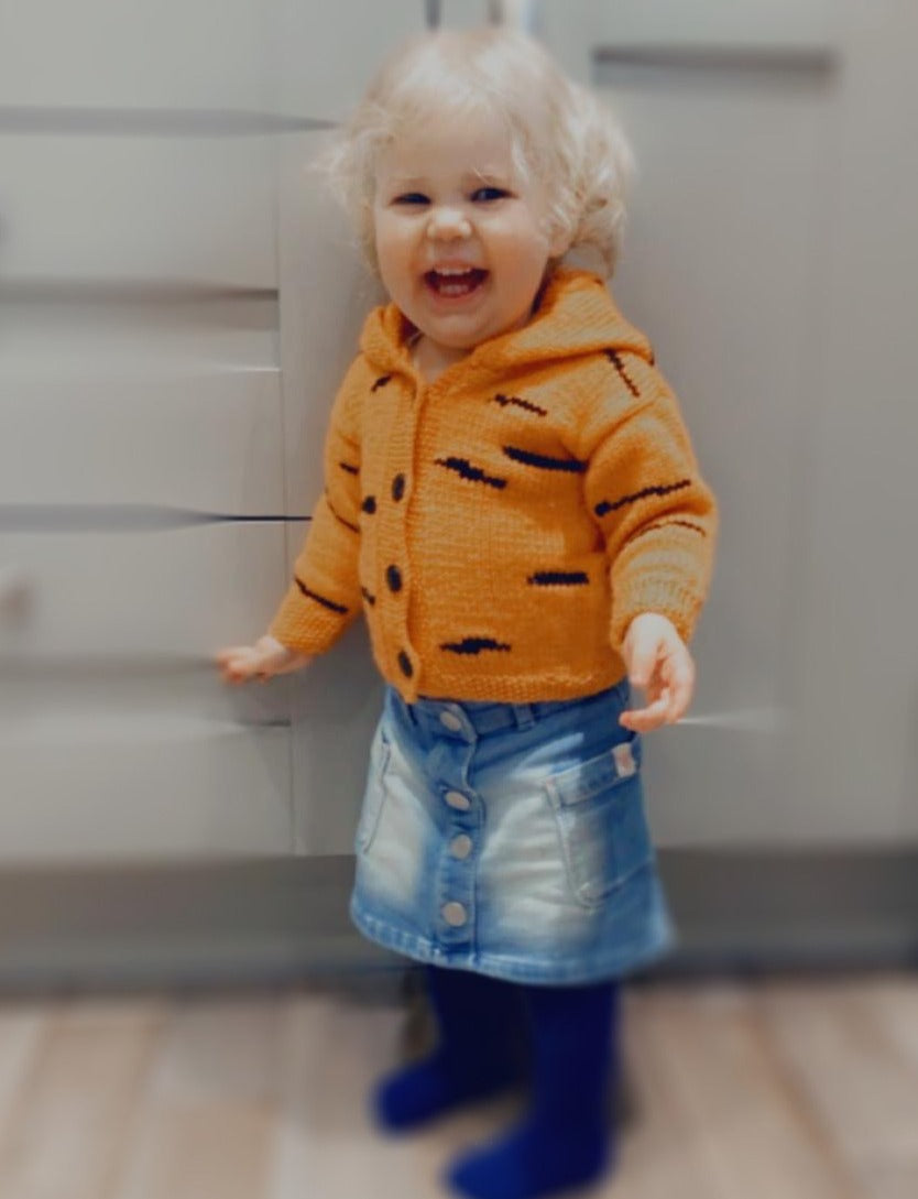 A great first knitting project, knitted from the bottom up with minimal shaping. The hood is sewn on at the end and the Tiger Stripes are swiss darned (duplicate) stitched on at the end. A chart is provided or you can be as creative as you like!