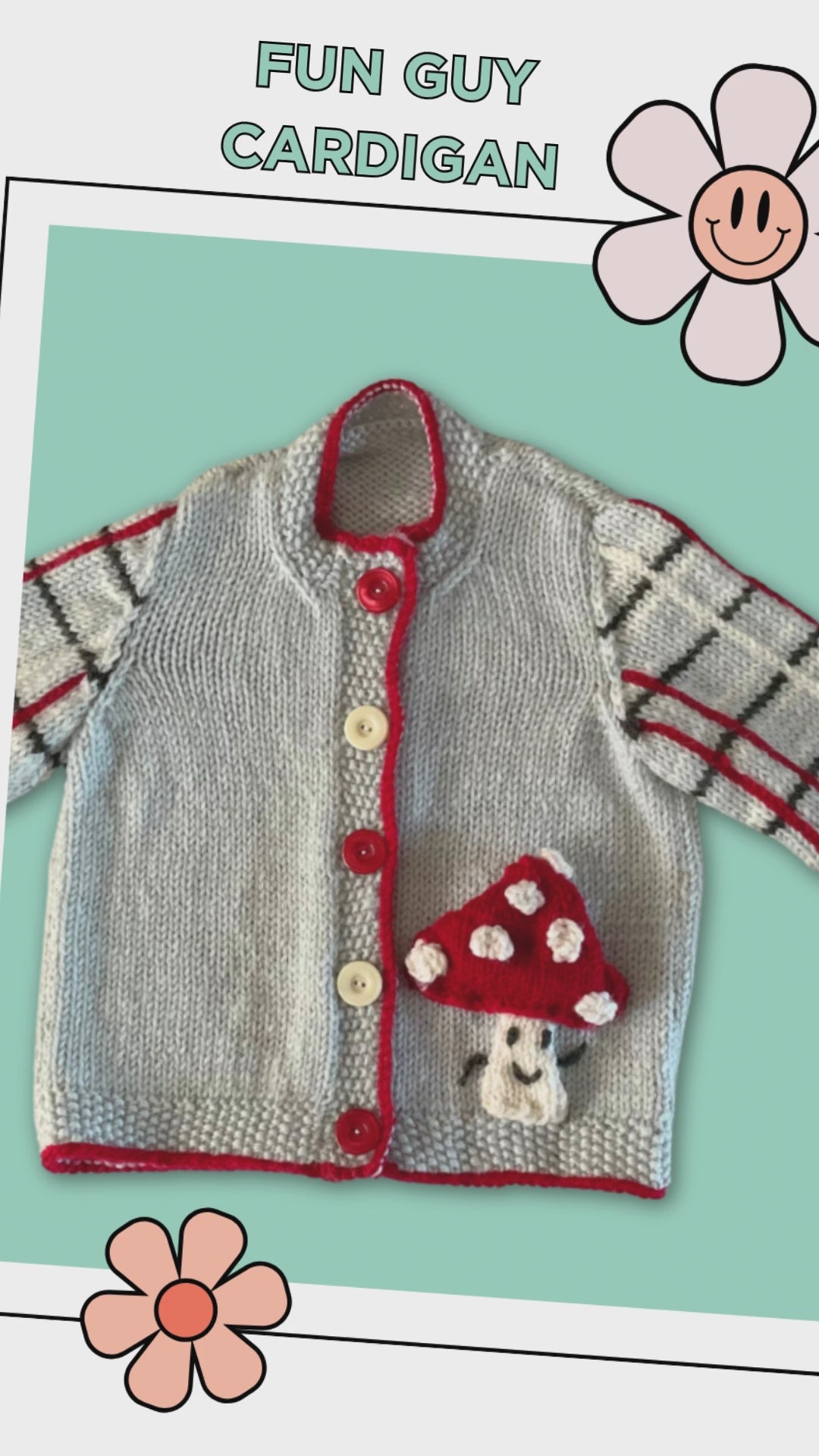 This super cute set-in sleeve cardigan has a moss stitch rib and button fastening. The sleeves are worked using a stripe sequence with columns of purl stitches. Once the sleeve is completed, a crochet hook is used to work a column of stitches into the purl ‘ditch’ row, full instructions are included. The mustroom character is worked separately and sewn on afterwards.