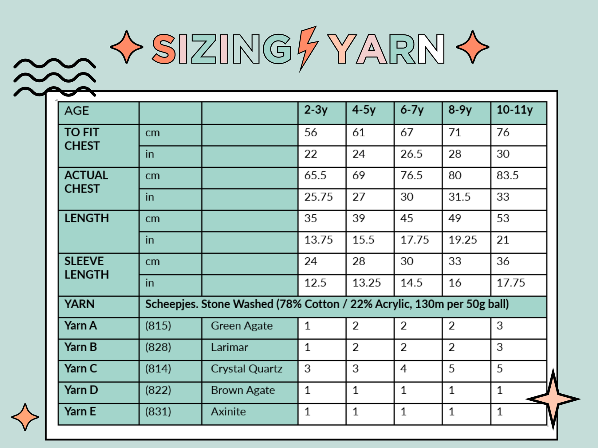 This sweater is knit from the bottom up and seamed. The classic drop shoulder style is sized to fit approx ages 2-11 years. Please see table below for more sizing and yarn details.