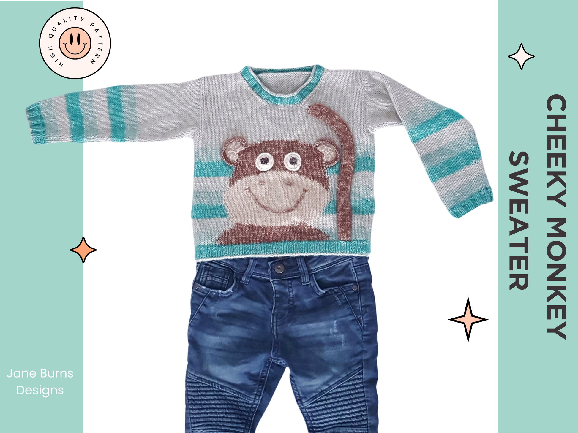 Cheeky Little Monkey Sweater, Simple Kids Intarsia Jumper - Knitting Pattern
