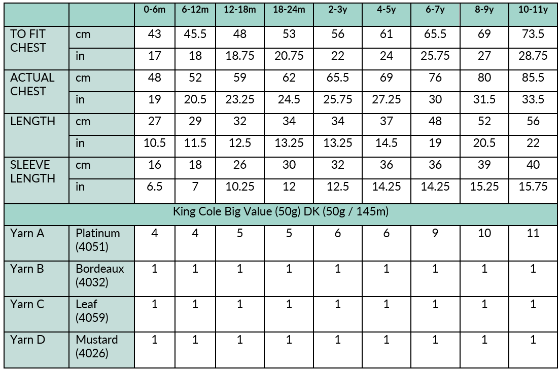 The project is sized to fit babies, toddlers and now upto 11 years old, and would make a fun gift for any budding dinosaur enthusiast. It’s knitted in King Cole, Big Value (50g) DK a machine-washable acrylic yarn, but would work well in any DK weight yarn (great stash buster).
