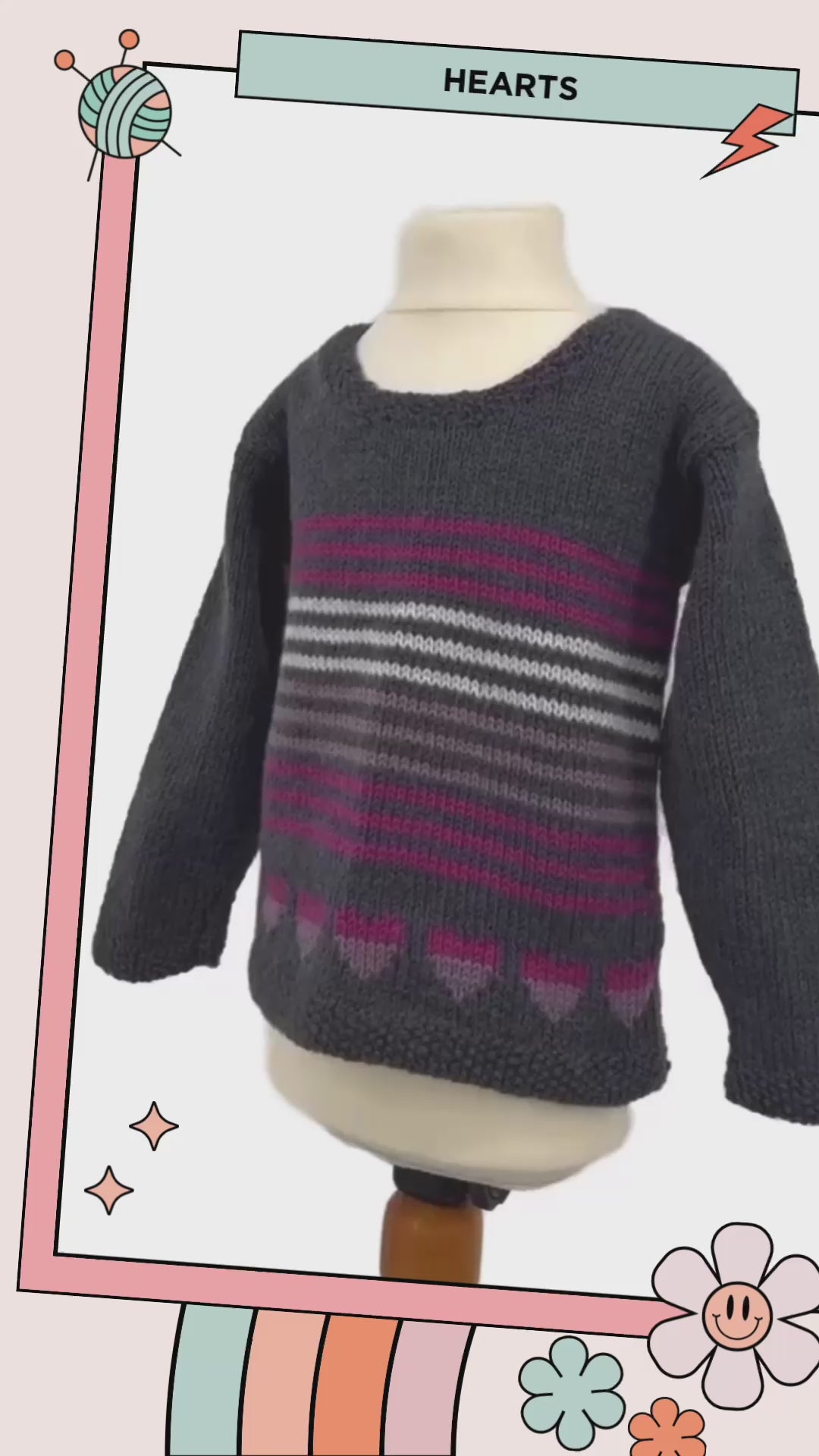 This cute sweater is knitted from the bottom up with a little stranded colour-work for the heart motifs, just perfect as a first stranded knitting project. Simple shaping and clearly written pattern instructions will have you knitting this in no time at all.