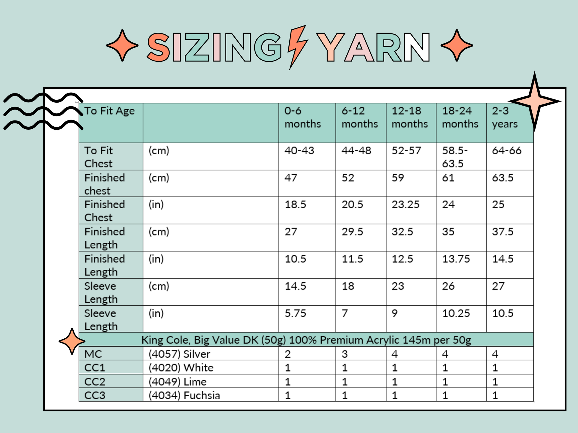 FOR FULLSIZING AND YARN REQUIREMENTS PLEASE SEE TABLE