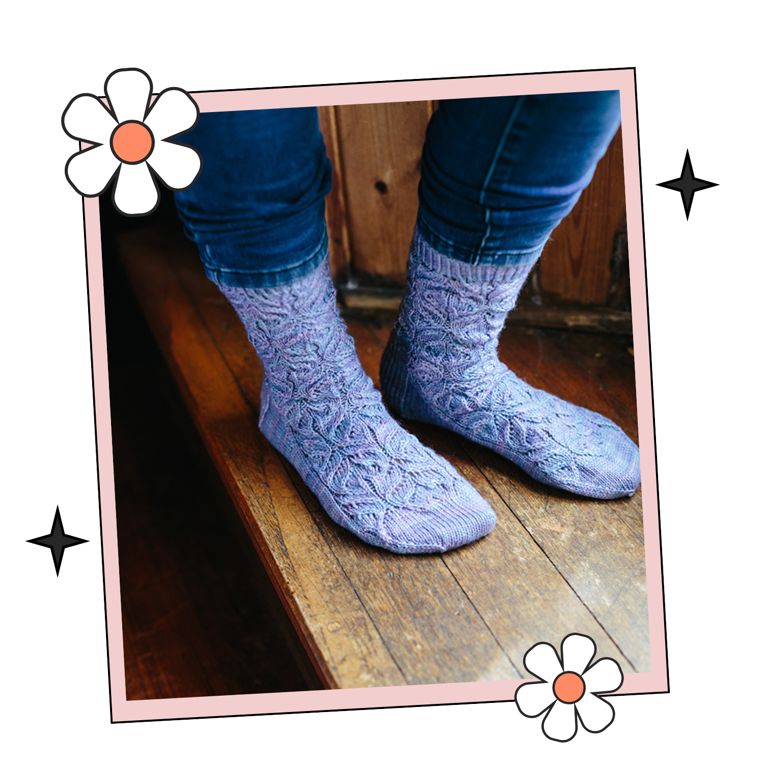 Curving lines of twisted stitches form stylised flowerheads on these pretty socks which are deceptively easy to knit. Using only basic decreases and yarn overs. The stitch pattern flows neatly down from the twisted rib cuff, and continues along the front of the foot; the design includes a slip stitch heel flap.